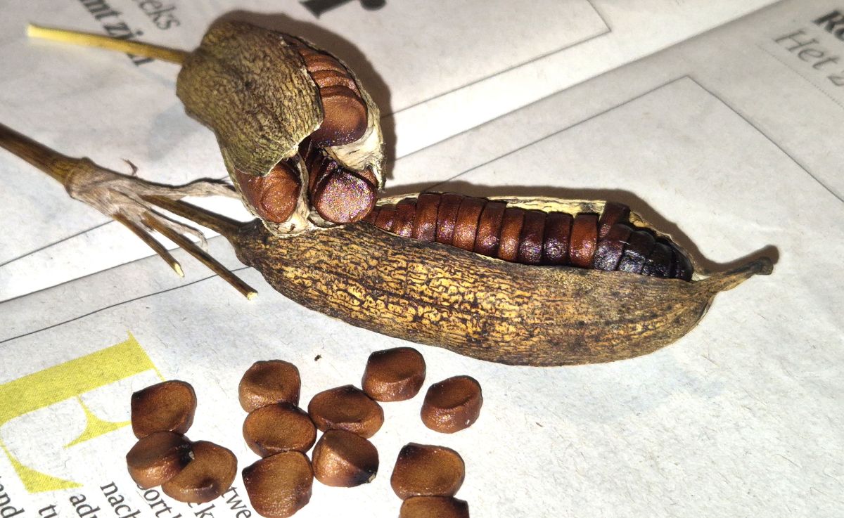 Ik laat de verse zaden van Vincent, nog met velletje, eerst 1 à 2 weken drogen. Zaai eind oktober Een kleine twee weken later: De schilletjes (het te gebruiken product) kwamen vanzelf los, en waren snel gedroogd. Nu nog op zoek naar mijn vijzel. De zaden zijn gisteren gezaaid. Twintig stuks van Goldfish (die hierboven, super vers), en twintig van Appelvrouw (oogst 2024). Bij elkaar moeten er toch wel een paar opkomen. Dat is gelijk een test om te zien of zaad van Szechuan zo snel kiemkracht verliest. Bloembak staat buiten onder een afdak, en blijft daar tot het voorjaar. (En gelijk maar -in dezelfde bak- ook Gele lis gezaaid, veel, heeft dezelfde behandeling nodig)