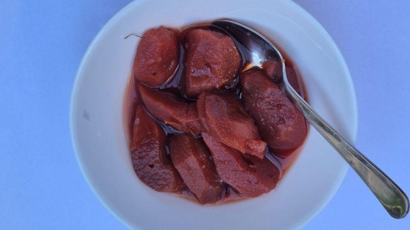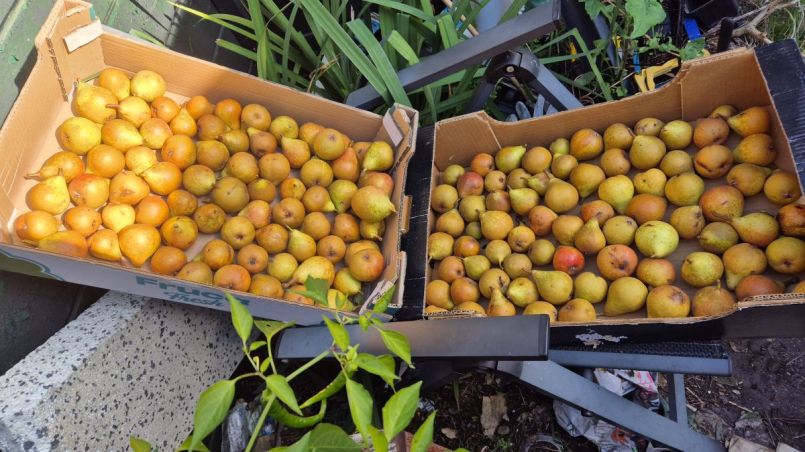 Gisteren en vandaag stoofpeertjes (Gieser Wildeman) geplukt, van één laagstam. (Staat er nu alweer11 jaar, als allereerste fruitboompje in mijn toen nieuwe tuin.) ^ Gemiddelde opbrengst, ene jaar wat meer, andere jaar wat minder. Een paar dagen geleden bekeken: ze lieten ze heel makkelijk los, dus pluktijd. Maar kneiterhard. Door de hardheid viel de zoetheid niet te proeven. Dus -vóór de echte pluk- maar een proefbereiding gedaan. Peertjes, water, en verder helemaal niks. Ook geen kleurstof: ^ Na bijna vier uur stoven. Nooit eerder zo gedaan, want altijd met deels port, wat verse gember of peper, klein snufje zout. Donkerrood, alleen van de peertjes! Ik was verbaasd. Ze waren ook echt zoet genoeg.