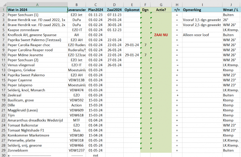Zaaironde begin februari is nu compleet. De volgende ronde komt begin maart (o.a. annuum pepers en paprika's) De "moeilijke" pepers (Carolina Reaper en Mdme Jeanette) zijn al opgekomen, na slechts 7 dagen! Nu wordt het hoog tijd voor de wintersnoei van fruitboompjes. De Gieser Wildeman heeft nogal wat waterloten, een Elstar moet gefatsoeneerd, net zoals de Schone en Rode Boskoop. De nieuwe aanplant 2023 (Conference, Elstar, Nashi peer) zal nog weinig tot niet bijgesnoeid hoeven te worden. De drie pruimenboompjes vereisen ook geen aandacht meer, want daar was ik klaar mee. Na 7 jaar nog nauwelijks opbrengst, weg ermee. De helft is inmiddels opgestookt in de houtkachel, de dikkere stukken moeten nog wat drogen. Waar is mijn munt? Had ik die twee potten maar van een bordje voorzien. Maar ja, niet gedaan. Gelukkig heb ik veel ruimte, én ben ik niet zo opruimerig. De munt moest dus ergens zijn, maar waar? Die vraag is inmiddels beantwoord, want ze komt weer op. Ziet er uit als munt, ruikt en smaakt naar munt, dus dat zal wel munt zijn. Gelukkig heb ik maar één soort munt. Het zaaiplan 2024 is een bijgestelde kopie van 2023. Geplande zaaidatums o.b.v. ervaring, én om file-vorming op de warmtematjes en LED-licht zoveel mogelijk te vermijden. ^ Minstens eens per week houd ik hierin de opkomst bij. Dan zie ik gelijk wat er nog moet, en wanneer (testvoorbeeld Jalapeno: "ZAAI NU") (Legenda: WM=warmtemat; LK=LichtKiemer; Ktemp=Kamertemperatuur; EZO=EigenZaadOogst) Lijkt overkill, zo'n lijst. Maar als je de lijst eenmaal hebt, is het jaarlijks bijstellen (wát opnieuw, wát niet, wát erbij) een makkie.