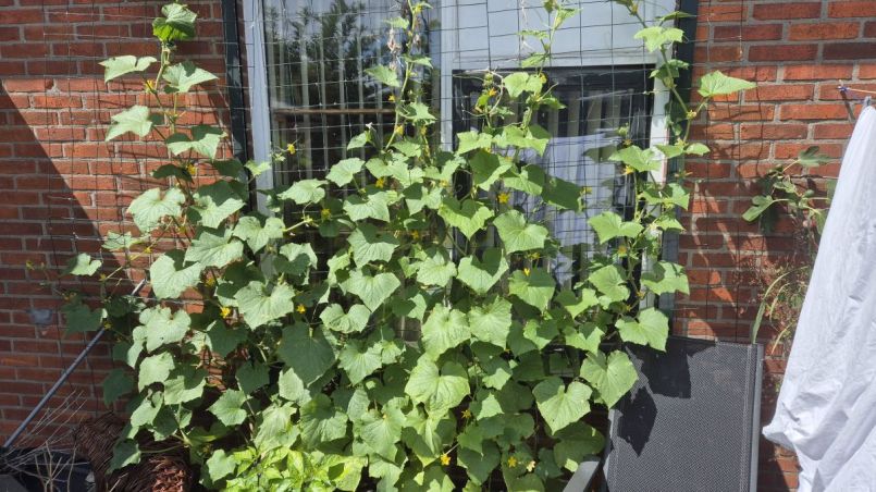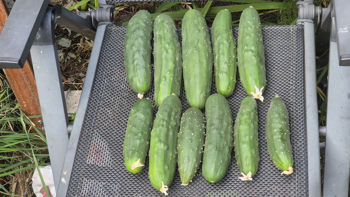 Even een update over de komkommer Market More, in het 2024 topic was daar interesse in, van meerdere mensen. Ze gaan hier net zoals andere jaren: probleemloos. Sinds een paar dagen is er oogst (ik was wat laat met zaaien). Twee per dag, van vier planten. Buitenkomkommer. Dus vroeg oogsten, voordat ze alleen maar dikker worden. Het oogstmoment is te zien aan de pukkels. Het is tijd als de pukkels (puisten?) beginnen te verdwijnen. Hopelijk gaat de oogst door tot begin oktober, net zoals andere jaren.