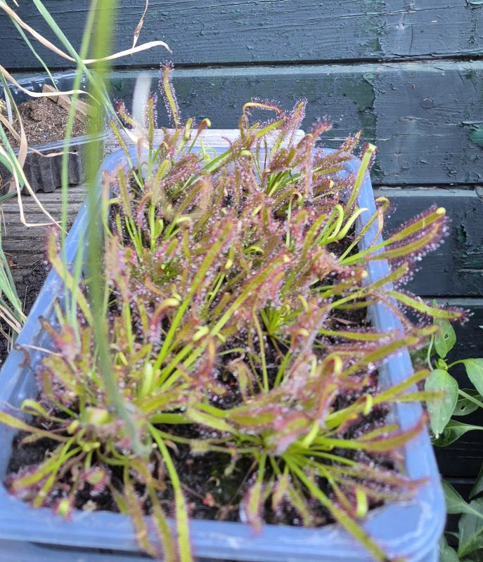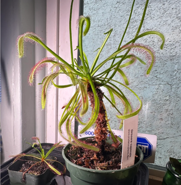Ziet er goed uit. Maar ik zie geen bloemstengels. Hier gaat het redelijk, maar een stuk minder goed dan vorig jaar. En waarom, dat weet ik niet. Slechts één bloemstengel, geeft toch wel ruim voldoende zaad voor volgend jaar. Overhouden, 's winters binnen onder kunstlicht, kan wel, maar is lastig. Luizen en varenrouwmuggen zijn een bedreiging. Luizen op een vleesetende plant? Ja, er hoeft er maar eentje op te komen (en niet gevangen te worden) en alle nakomelingen blijven netjes onderaan, en zuigen alles leeg. Eén keer is het mij gelukt. Je krijgt dan een palmboomachtig stammetje. Daarna niet meer geprobeerd: 4 maanden extra (okt-jan) de LED verlichting aan, met weinig kans op succes. (niet mijn foto)