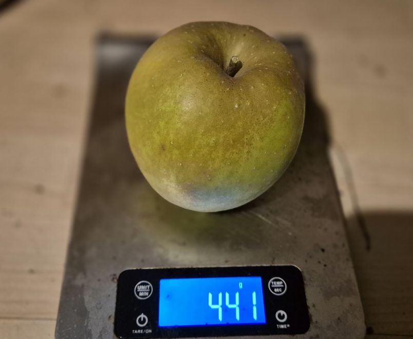 Deze renet (Schone van Boskoop) plukte ik gisteren, als één van de 32 kilo van één laagstam: ^ 441 gram voor één appel. Zonet even gekeken naar standaard appeltaartrecepten met aantallen appels zonder het totaalgewicht te vermelden: Dat varieert van 5 tot maar liefst 8 appels per standaard appeltaart!