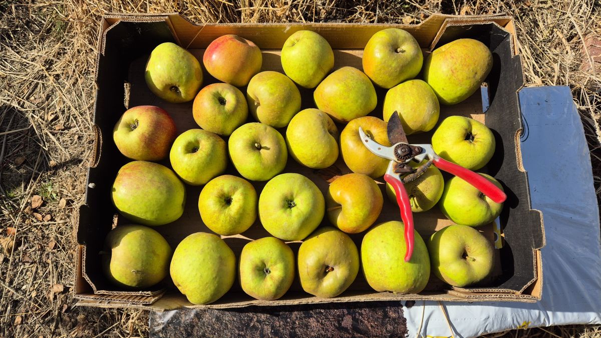 Gisteren appels geplukt, het werd echt tijd: ze lieten erg makkelijk los. Prima opbrengst: vier dozen à ca. 8 kilo: ruim 32 kilo. Van één laagstam Schone van Boskoop (goudrenet). Een raar appeljaar, droog. Daarbij heb ik dit jaar geen water gegeven, en niet bemest. En toch veel appels, en groter dan anders. ^ Eén van de vier dozen. Snoeischaar ligt er alleen bij voor de maat. De (op het oog) grootste woog 390 gram. [Edit] De allergrootste blijkt 441 gram te wegen! [/Edit] Morgen ga ik maar eens kijken of de Gieser Wildeman al echt plukrijp is