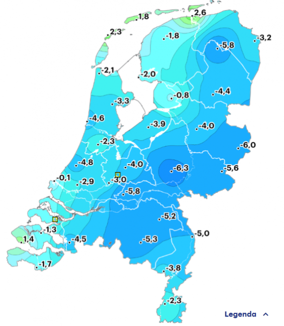 Frisjes, vannacht. Minimum temperaturen op 1,5 m hoogte: Op klomphoogte was het beduidend kouder: - 10,8 in Winterwijk. Temp. op klomphoogte is voor ons nu nog niet interessant. Niemand zal nu al vorstgevoelige plantjes buiten hebben staan. (En als wél: dan is dit een harde, maar goede les) Ik ben goed weggekomen (minimum was hier +0,5 graden, op 2 m hoogte). Maar de vele fruittelers in de Betuwe, met daar -5,8 graden op 1,5 m hoogte ??