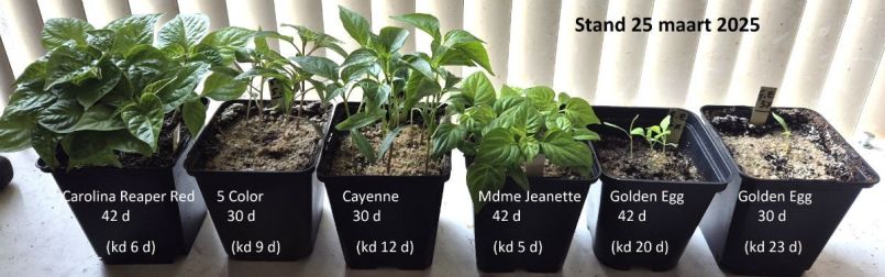 De stand van zaken hier, van een paar pepers die verspeend moesten worden (na de foto gedaan). ^ Aantal dagen tussen zaaien en nu / tussen haakjes de kiemduur. Potmaat: P9. Wat opvalt is dat de kiemduur van de Chinenses (CRR en Mdme Jeanette) zo kort was. De wedstrijdplant staat er ter vergelijk bij. Ik had verwacht dat aubergine minstens zo snel als peper is. Maar ja, ik mis de Steen der Wijzen, om gewone eieren in gouden eieren te veranderen.