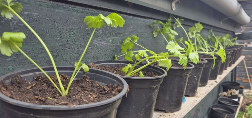 Mijn knolselderij zaailingen staan nu buiten, op een slakvrije plek. Het is nog wel vrij fris buiten, maar binnen heb ik echt geen plek voor die vrij grote potten. (Wel de maat pot om kleine zaailingen in over te potten) Uitplanten in de volle grond doe ik pas begin juni.