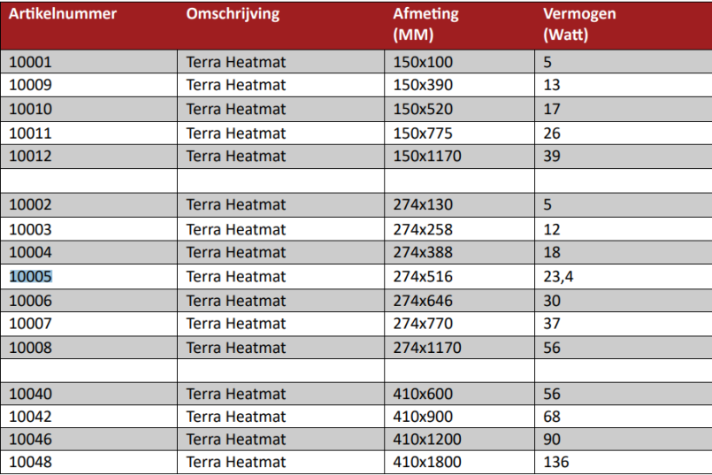 Over warmtematjes, en of het Wattage wel genoeg is. Ik heb Heatel terramat, net zoals Erny. De NL fabrikant ("Koop Hollandsche waar!") heeft veel verschillende formaten (zie onderaan). Maar allen verbruiken hetzelfde aantal Watts, omgerekend naar hetzelfde oppervlak. Ook is die Amazon mat van 24 x 52 cm, 20 Watt, goed vergelijkbaar met een Heatel terramat 10005, 27 x 52 cm, 23,4 Watt. Mijn ervaring met de Heatel terramat: meer dan goed, vlak en strak, uitstekend schoon te maken. Ze (de kiemende plantjes) worden zeker warm genoeg, eigenlijk toch nog te warm (in een woonkamer met overdag 20, 's nachts 17 graden). Daarom gebruik ik daarbij een thermostaat. Zo kan ik afregelen dat de Chinense pepers kiemen op 26 à 27 graden, en (later) de Annuum pepers en tomaten op 23 à 24 graden. Of willekeurig welke andere temperatuur. Erny noemde al een Heatel-leverancier. Hier nog eentje: https://www.dekammieshop.nl/heatel-terra-heatmat-23-5w Erny doet het zonder thermostaat, maar met een schakelklokje (zo'n ding dat je ook voor de kerstboomlichtjes gebruikt). Ik heb daar geen ervaring mee, maar op de gok. @Erny: verbeter mij) Ca. 26 graden grondtemperatuur: Schakelklok instellen op steeds 1 uur aan, 1/2 uur uit Ca. 23 graden grondtemperatuur: Schakelklok instellen op steeds 1 uur aan, 1 uur uit Ik gebruik wel een thermostaat met sensor in de grond. Zelfbouw, zie: https://www.moestuinforum.nl/topic/38552-een-thermostaat-bij-je-warmtematjes/#comment-470725 De complete leveringsomvang van Heatel:
