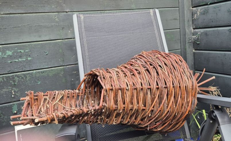 Tja, vlechten. Ik heb er deels de spullen voor, zoals een paar wilgen achterin mijn tuin. Dan ook maar een tip voor degenen zonder wilg: Gemiddeld eens per drie (vier?) jaar wordt er geknot, door het waterschap, de provincie of de gemeente. Dat levert per boom (langs de weg op elke acht meter) een forse stapel op. Die stapels worden wel steeds verhakseld en afgevoerd, maar elk einde van elke dag valt er meer dan genoeg te "rapen". Maar vlechten, dat laat ik doen: Broedkorf gekocht bij de nabije eendenkooi (€ 30,-). De korf plaats ik over een paar dagen (nu nog weken wachten kan niet) in de brede sloot bij mij achter. Ik heb al een waadpak geregeld, want een watertemperatuur van ca. 5 graden, gedurende ongeveer 15 minuten, dat is mij te gortig. Mijn doel zal duidelijk zijn: een mooi nest voor moeder eend, en vanaf het terrasje aan het water wil ik "live" die pulletjes zien. Voor de vlechters hier: broedkorven vlechten lijkt me geen verdienmodel.