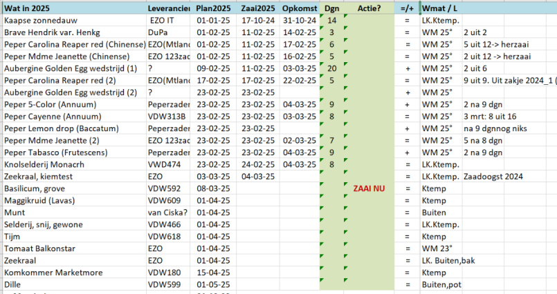 Het rampjaar 2024 hebben we gehad. Ik heb nog nooit zo'n slecht moestuinjaar meegemaakt Nu op naar 2025. Plannen binnenkort: - Nu: Verspenen Kaapse zonnedauw (eind oktober 2024 gezaaid, was eigenlijk alleen kiemtest) - Volgende week: wintersnoei fruitboompjes (Elstar, Schone Boskoop, Rode Boskoop, Conference, Nashi peer, Gieser Wildeman. - Volgende week: ophangen nestkastjes mussen (3x3) - Volgende week: plaatsen van een eendenbroedkorf in mijn sloot. Waadpak is al geregeld. - Over twee weken: voorzaai, van Chinense pepers - Binnenkort: omzagen van een kronkelwilg van nu +8 meter hoog. ^ Zo een planning helpt wel: al is het maar om steeds voldoende plek op mijn warmtematjes, en onder LED-licht te hebben Weinig vollegronds eenjarigen dit seizoen. Eerst maar eens mijn tuin reorganiseren, want: - Mijn tuin raakt overgroeid met wilde braam, in het verwijderen gaat veel werk zitten - Padvinder spelen. Mijn betegelde paden zijn "kwijt", die liggen ergens, onder begroeiing.