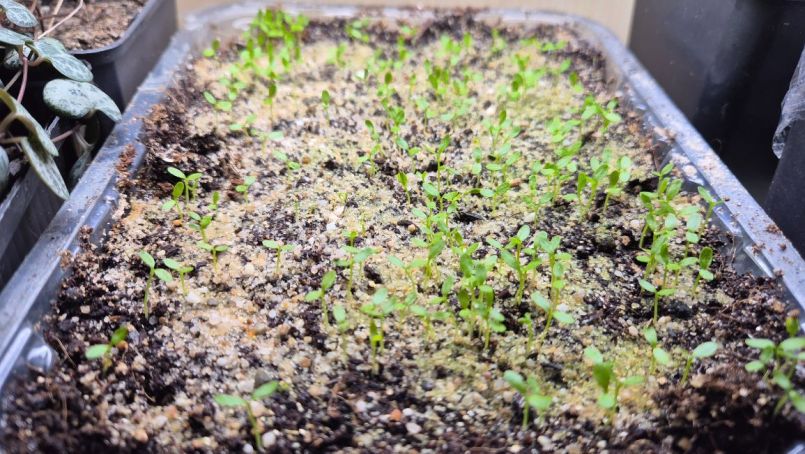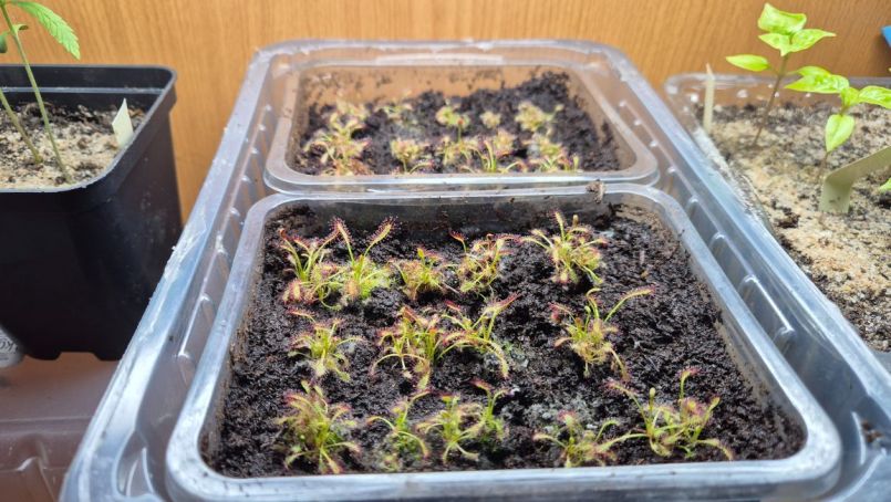@appelvrouw: OK. @Rookie: OK Huidige stand zaailingen: Links: Kaapse zonnedauw. Elk plukje is 2 a 5 plantjes Rechts: knolselderij: totaal 100+ stuks