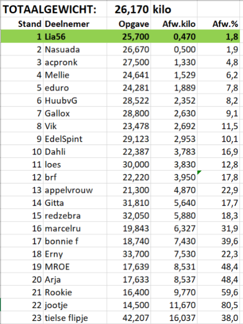 Een testje. Wat doet de status 'verborgen' ? Kan ik die nog zien: Ja, en ik kan de status wijzigen in 'zichtbaar maken' Maar: kunnen andere moderators dit bericht wel zien, i.t.t. gewone gebruikers) ? Stand Deelnemer Opgave Afw.kilo Afw.% 1 Lia56 25,700 0,470 1,8 2 Nasuada 26,670 0,500 1,9 3 acpronk 27,500 1,330 4,8 4 Mellie 24,641 1,529 6,2 5 eduro 24,281 1,889 7,8 6 HuubvG 28,522 2,352 8,2 7 Gallox 28,800 2,630 9,1 8 Vik 23,478 2,692 11,5 9 EdelSpint 29,123 2,953 10,1 10 Dahli 22,387 3,783 16,9 11 loes 30,000 3,830 12,8 12 brf 22,220 3,950 17,8 13 appelvrouw 21,300 4,870 22,9 14 Gitta 31,810 5,640 17,7 15 redzebra 32,050 5,880 18,3 16 marcelru 19,843 6,327 31,9 17 bonnie f 18,740 7,430 39,6 18 Erny 33,700 7,530 22,3 19 MROE 17,639 8,531 48,4 20 Arja 17,633 8,537 48,4 21 Rookie 16,400 9,770 59,6 22 jootje 14,500 11,670 80,5 23 tielse flipje 42,207 16,037 38,0