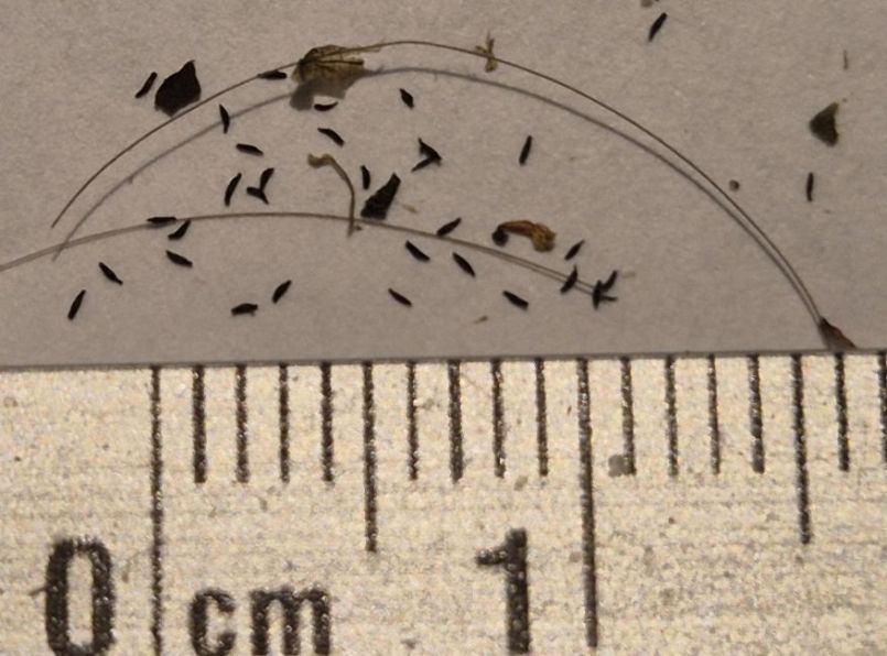 Mijn zaadoogst Kaapse zonnedauw 2024 is al een tijdje binnen. Veel, ondanks de slechte zomer. Gelukkig had ik erg vroeg gezaaid (dec '23). Was een kiemtest, waar ik toch maar mee doorging. 10+ pakjes zaadjes zitten in de zadendoos. Ik heb er meer, op verzoek kan ik ze opsturen. Doe maar een PB. ^ Kiemtest 17-10-23. In P9 potje. Opkomst al na 14 dagen. Verspenen (later) is wel even gepriegel, maar de plantjes slaan weer heel makkelijk aan. Zaaien (binnen) kan nu al wel (lichtkiemer!), of tot begin februari. Nadeel: kans op luis. Voordeel: eerder bloemen, meer kans op afgerijpt zaad in het najaar, ook bij slechte zomers zoals in 2024. In één pakje zit ruim genoeg zaad om meerdere keren te zaaien. Ik kreeg wel een vraag, van Dahli, een zadendoosdeelnemer. "Wat zijn nou de zaden, die paar grotere stukjes, of dat stof?" Begrijpelijk, want het zaad is idioot klein: 1 mm lang, en nauwelijks dikker dan het hoofdhaar van een mens op leeftijd. ^ Het kaf (die grotere stukjes) hoef je niet van de zaadjes (het koren) te scheiden. Gewoon meezaaien.