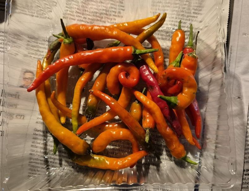 Mijn peper-verslagje seizoen 2024: Chinense (Mdme Jeanette en Carolina Reaper red, CRR) gezaaid rondom 1 februari Annuum (Cayenne) gezaaid rondom 1 maart. Alles naar buiten: eind mei (later dan normaal), toen was alles gemiddeld 25 cm hoog. Daarna, buiten begon de ellende: trage groei. Uiteindelijk is de helft van de CRR mooi afgerijpt, zo ook ruim de helft van de Jeanettes. Maar die Cayenne: driekwart is nu nog steeds knalgroen! Dat wordt (bijna) niks meer. Op zich niet erg, want 2023 was een perfect Cayenne jaar. Bijna een kilo, waarvan er nu nog zo'n 300 gram in de vriezer ligt. Volgend jaar nieuwe ronde, nieuwe kansen. Voor het volgend seizoen kan het alleen maar beter dan seizoen 2024 worden.