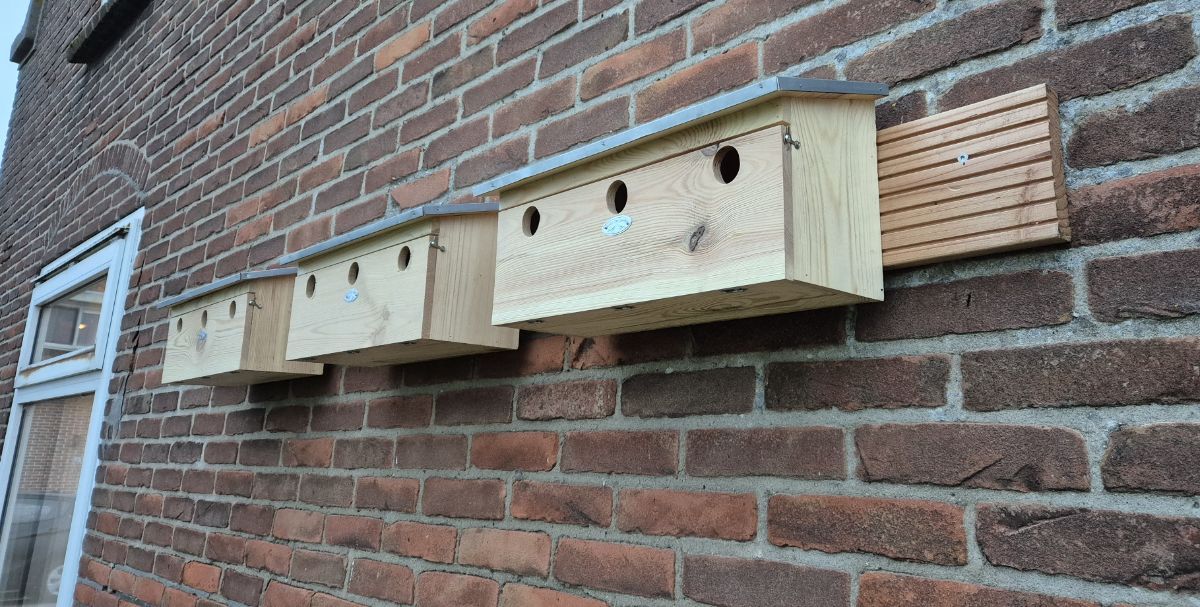 Nestkastjes voor mussen. Op 15 december schreef ik: https://www.moestuinforum.nl/topic/7140-welke-vogels-zie-je-in-je-tuin-of-op-je-balkon/page/49/#comment-536780 In totaal had ik 11 kastjes aangeschaft. Vier als kerstcadeautje aan familie (alle vier hebben een tuin), drie voor mijn "mussenfreak" buurman D., en drie voor mezelf. Die voor mezelf hang ik vandaag of morgen op (het wordt hoog tijd: mussen gaan nu al op zoek naar nestgelegenheid). Bij buurman D. ben ik gisteren bezig geweest. Resultaat daarvan is simpel en in theorie (o.a. hoogte ca 2 meter; richting Noordoosten) doeltreffend: In theorie, nu maar wachten op de praktijk. Negen tiny houses dus. De kosten (voor buurman D.) vallen erg mee: 3 x 20,- nestkastjes + 12,- voor de Douglas vlonderplank = € 72,-. dat is € 8,- per tiny house. Bij een geschatte levensduur van vijf jaar: € 1,60 per tiny house per jaar.