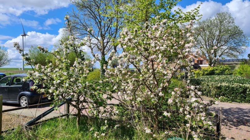 In mijn voortuintje staat een rode Boskoop en een Schone van Boskoop (beide goudrenet). Vorig jaar was de oogst redelijk. Niet heel goed, door enorm droog weer, en zeer matige verzorging. Te weinig water gegeven, te weinig mest. De oogst 2022 was wel perfect. Toen had ik ze beter verzorgd: Incl. de iets latere napluk ca. 35 kg Rode Boskoop, 25 kg Schone van Boskoop. Dankzij het goede weer en goede verzorging waren ze beide heel fors aan de maat, sappig en echt heel zoet, met toch nog een zuurtje. Vooral de rode Boskoop is perfect voor bereidingen (sap, appeltaart, wijn), en zeker ook als handappel. En nu, vandaag, een voorbode. Weliswaar zonder enige garantie op een mooie oogst: ^ Links de Schone van Boskoop. Rechts de rode Boskoop. Laagstam, nu 7 jaar oud. Plan was om er mooie leiboompjes van te maken. Maar dat is niet echt gelukt, vooral omdat je dat heel goed moet bijhouden. Dat is niet mijn sterkste punt. Toch ben ik er heel blij mee. (Fruit in je voortuin, in een drukke, stadse straat is wellicht niet aan te bevelen (door teveel wildpluk), maar hier kan het prima.)