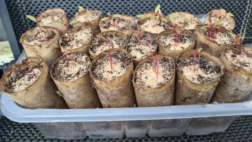 Stand van zaken vandaag, op 29 april gezaaid. De eersten kwamen al na 4 dagen op, de paar laatsten na 10 dagen. Ik heb zeer ondiep gezaaid. ^ In alle rolletjes is er minstens één opgekomen, van de 1 à 3 stuks per rolletje.