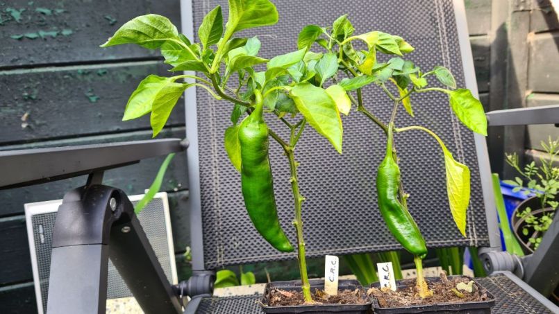 Hier gaat het naar omstandigheden redelijk. Allemaal buitenteelt, maar ze zijn pas een kleine twee weken verpot van P9 naar 10 L bouwemmers en naar buiten gezet. Van superheet naar mild: ^ Carolina Reaper red ^ Madame Jeanette. ^ Cayenne. Nog pierige plantjes, maar dat komt wel goed. ^ Jalapeno. Bloemen, nog geen vruchtjes. ^ En hier ook maar even de Sweet Palermo (dunwandige zoete puntpaprika). Uit zaad van in de winkel gekochte vruchten.
