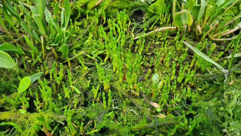 @Frans: Dat gaat redelijk goed. Wel veel sneller dan hier. Na het enorme slakkenprobleem heb ik pas op 7 mei opnieuw gezaaid. Nog maar 12 dagen geleden dus. Dat is ruim vier weken later dan jij. Nog steeds enorm veel last van slakken, maar niet meer bij de zeekraal. Want de bak staat bovenop een barbecue. Nu, vandaag: Over een paar dagen ga ik ook beginnen met wat zoutiger water. Eerst maar eens hoogstens 1/3 van zeewater. Een paar dagen geleden, op het schor: Bij redelijk warm weer kan ik vanaf het schor, vanaf begin juni, al mijn eerste maaltje oogsten (?).
