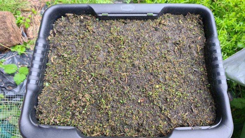 Mijn Kaapse zonnedauw, gezaaid (uiteraard binnen) 1 december 2023. Een paar MTFD-aanwezigen hebben daar exemplaren van. Een paar anderen hebben later zaad gekregen, via de zadendoos of per directe post. Het gaat wel goed, maar beginnende bloeistengels zijn nog niet te zien. Ze staan in vrij grote bak (een dubbele 2 kilo mosselbak)
