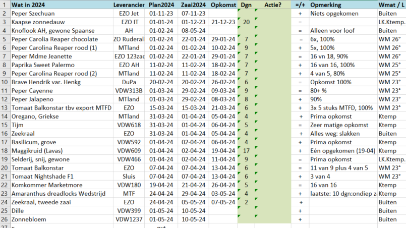 Hèhè, het is gedaan. Vandaag de laatste twee soorten gezaaid: - Dille - Zonnebloem, ras zou 2 à meter hoog moeten worden. Véél: ik ga ook aan guerilla gardering doen. Over een paar (?) dagen alleen nog even de opkomst noteren, op dit Excel lijstje: Ik heb dus niet te klagen over de opkomst, voor zowel het aantal dagen als het percentage.