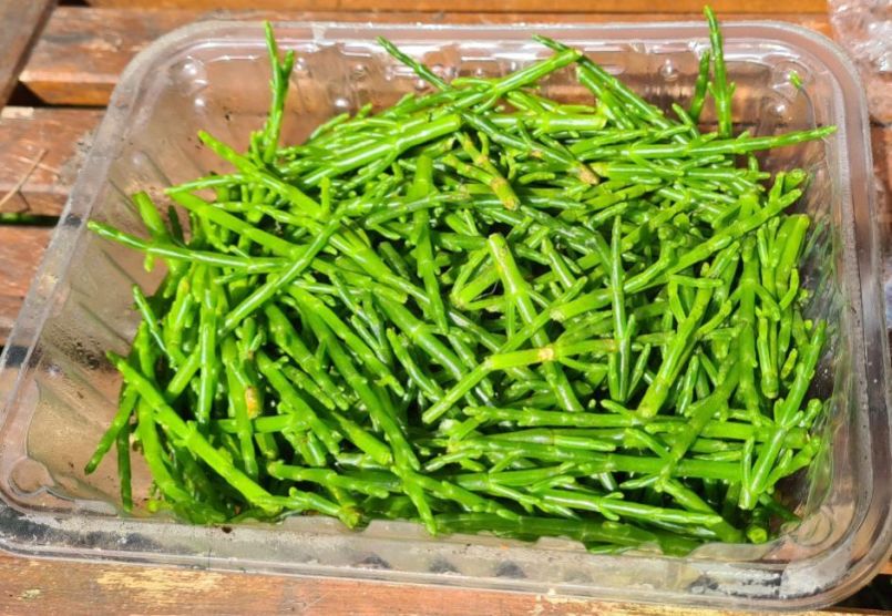 Gisteren de eerste oogst. Helaas niet uit eigen tuin. Die teelt is mislukt. Enkel potgrond was geen succes. Mijn plan B. Even naar het schor vlakbij. Het is nog vroeg, alleen de weinige zeekraal vlak bij de dijk begint oogstbaar te worden. Verderop het schor zijn ze nu echt nog te klein. ^ Ruim een half uur kijken, zoeken en bukken leverde ongeveer 300 gram op. En 150 gram p.p. is echt wel genoeg. Gisteren met zalm, vandaag met kabeljauw. Lekker! Heel jammer dat zeekraal niet in te vriezen is. Tijdens het hoogseizoen ga ik dat toch maar weer eens proberen, op diverse manieren.