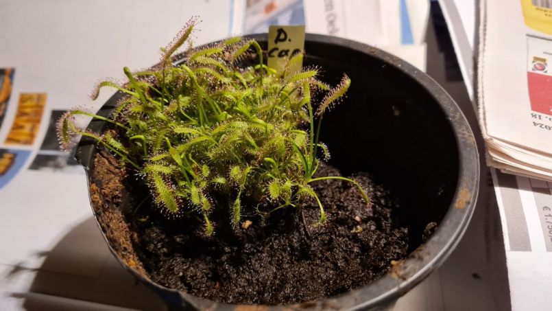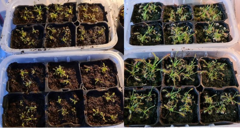 De Kaapse zonnedauw begint er een beetje zin in te krijgen: ^ Links: 27 februari. Rechts: 20 maart (drie weken later)