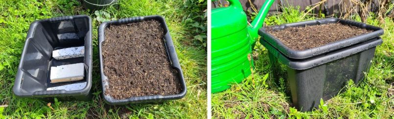 Voor mijn archief: Zonet de zeekraal gezaaid. Veel (ik had genoeg), onderlinge afstand is kleiner dan 1 cm. De bak(en). Bovenste met gaten onderin, en uiteraard aarde. Onderste zonder gaten, en met wat vulmateriaal om voldoende ruimte te krijgen tussen de twee onderkanten. De ruimte is vooral voor het inunderen / bevloeien. Daarbij zijn de handvatten van de bovenste bak nu wat meer vrij. Dat is makkelijker uittillen. Straks nog tijdelijk een stuk gaas 10 x 10 mm erover, tegen eggende merels en ploegende katten Verwachte oogst? Ik hoop op een kilo totaal. Van een kwaliteit die in de winkel niet te krijgen is, in ieder geval niet buiten Zeeland.