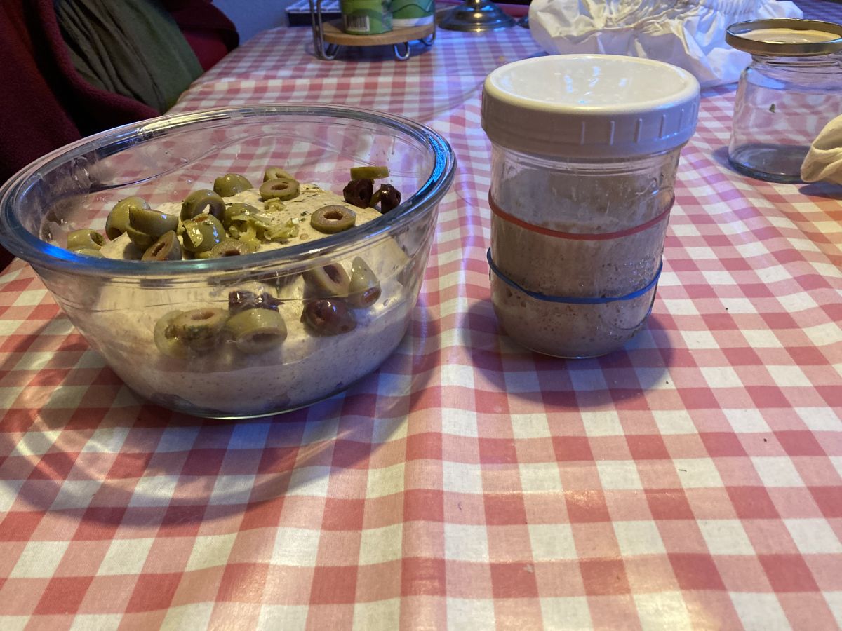 Als dit maar goed komt: Ik ben bezig met het desembroodje met olijven voor zaterdag..lekker op weg, nog 1 x vouwen na het toevoegen van de olijven, later vormen en dan een nachtje in de koelkast. Het deegje is al lekker elastisch! Zie ik plots de pot met het desem nog naast het deeg staan. Nog nooit gehad haha. Overnieuw beginnen met folds en nu gelijk proberen het desem voorzichtig door het deeg te vouwen..ik wil niet dat de speltgluten scheuren. Verdamme😝