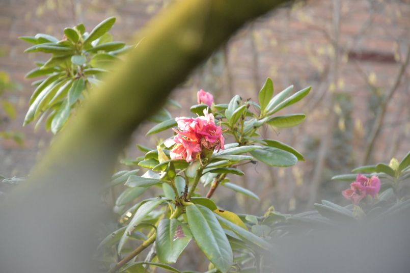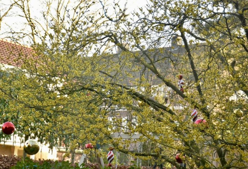 In de tuin in het westen bij de directe buren een prachtige oude hamamelis die ook als een soort Kerstboom wordt gebruikt ( vind ik vreselijk om aan te zien😜) en ook een rhododendron in winterbloei.