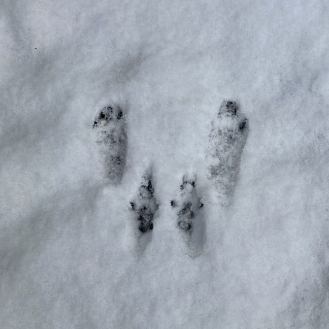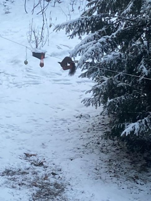 Vanmorgen bij het openschuiven van het gordijn meteen dit beeld: Eindelijk heeft de eekhoorn het voor elkaar..al meer dan een jaar loeren deze boomkonijnen op het vogelvoer dat alleen veilig aan de waslijn is..of was dus. Knap is het wel. Waarschijnlijk lukt het nu wel omdat de takken van de taxus veel stijver zijn met de bevroren sneeuw erop. Hij of zij kreeg er weinig uit trouwens, dit dubbele zakje met zonnepitten is te stevig. Ik heb het wel een eindje opgeschoven trouwens, en meteen wat halve appels voor de merels en een stuk kaaskorst aan de lijn gebonden..de beessies hebben honger! Ze geven wel mooie sporen, de sneeuw rond de grove dennen zit er vol mee.