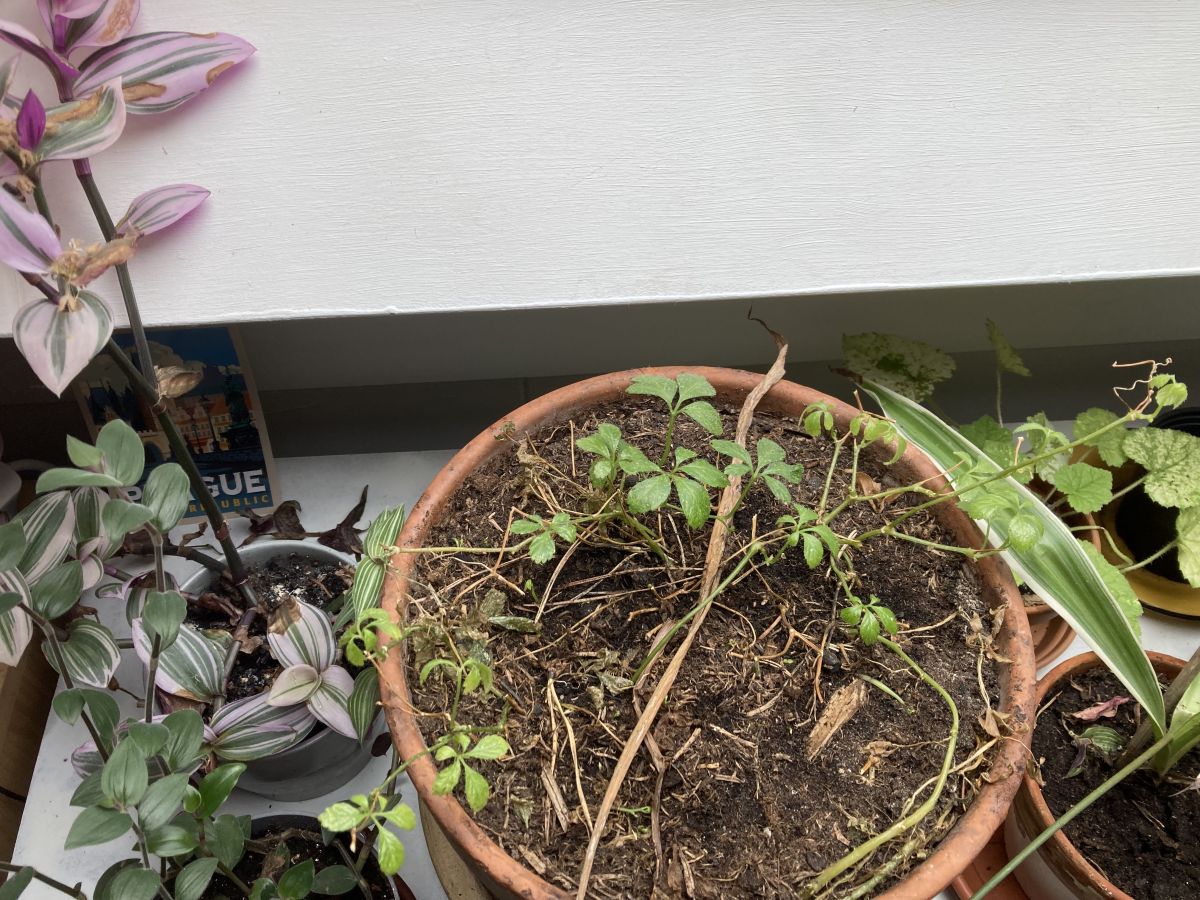 Zo ziet de plant erbij mij uit na een halve winter op een redelijk warme slaapkamer. In eerste instantie viel het me tegen: veel blad verdorde. Ik had er wel wat compost opgelegd. Maar nu zie ik meerdere groei punten ontstaan. Ook het kleine plantje dat ik had was helemaal afgestorven maar loopt nu weer uit🥳