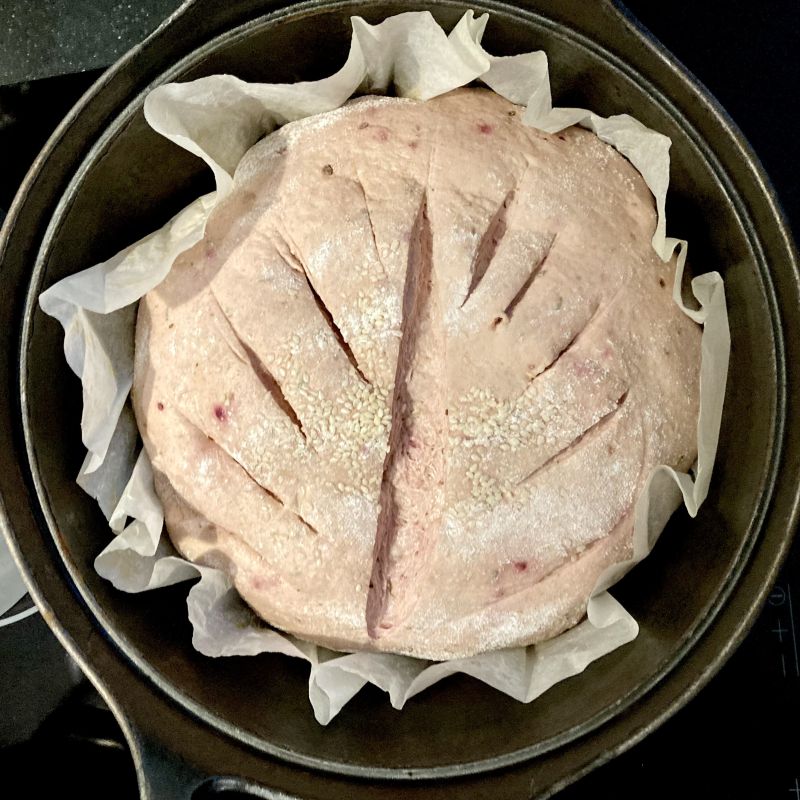 Weer een desem vandaag met speltbloem en slaege emmermeel. Nog wat rode biet poeder en tijm. Het brood is steeds meer naar mijn zin. Het bakken in de pan in de oven bevalt ook goed, ik heb precies de goede hoeveelheid deeg om het brood net niet tegen het deksel aan te laten rijzen. Het speltdesem is ook goed, ik moest het nog een beetje leren kennen het lijkt een beetje minder sterk dan het roggedesem wat ik ook onderhoud maar het werkt goed!