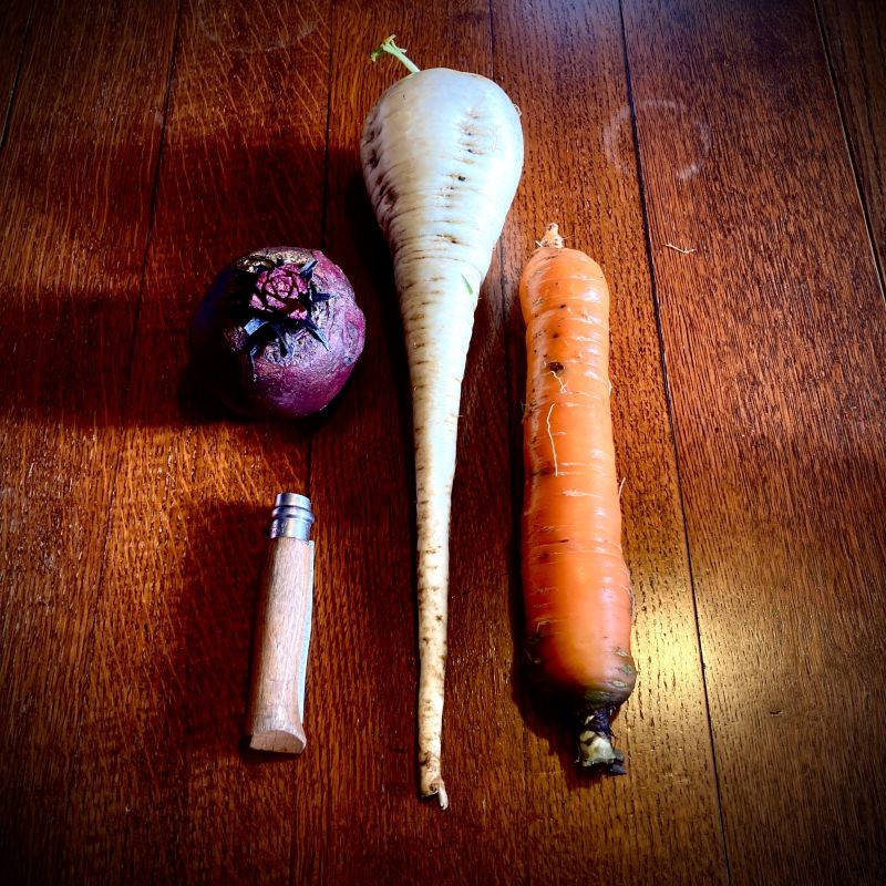 En het is goed gegaan, het was hier vannacht 1 graad. De paksoi staat er nog minus deze al wat grotere kleintjes. Kruiden ook uet de wortels zijn uit Jorieke’s tuin
