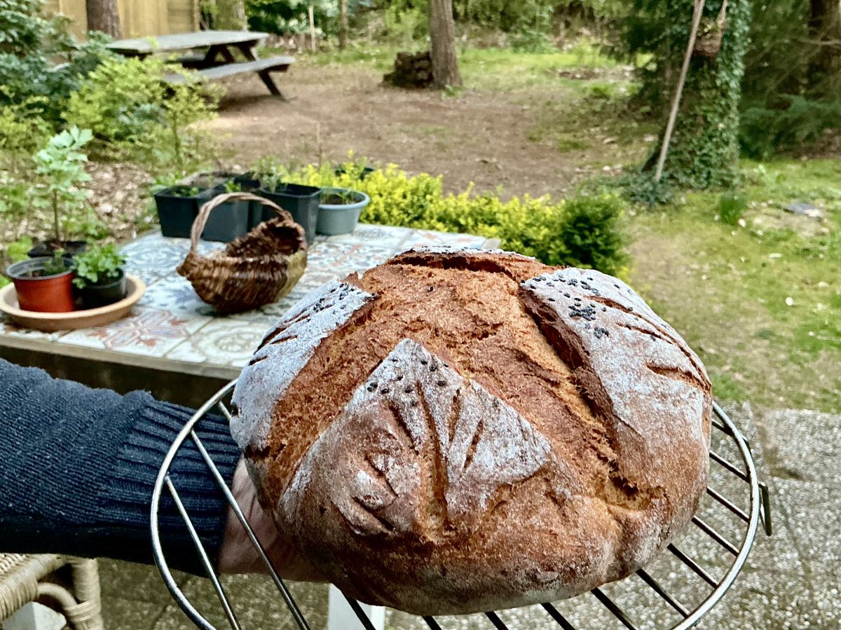 Vandaag een tarwegistbroodje gebakken met daarin, beide uit Jorieke’s tuin, een eendenei en een theelepeltje bietenpoeder.