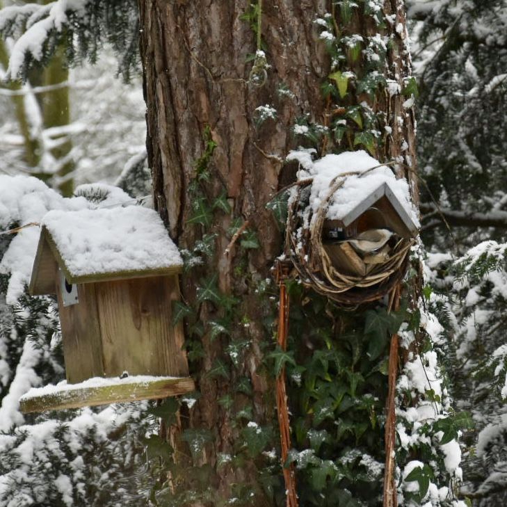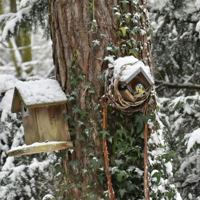Vanmorgen bij het openschuiven van het gordijn meteen dit beeld: Eindelijk heeft de eekhoorn het voor elkaar..al meer dan een jaar loeren deze boomkonijnen op het vogelvoer dat alleen veilig aan de waslijn is..of was dus. Knap is het wel. Waarschijnlijk lukt het nu wel omdat de takken van de taxus veel stijver zijn met de bevroren sneeuw erop. Hij of zij kreeg er weinig uit trouwens, dit dubbele zakje met zonnepitten is te stevig. Ik heb het wel een eindje opgeschoven trouwens, en meteen wat halve appels voor de merels en een stuk kaaskorst aan de lijn gebonden..de beessies hebben honger! Ze geven wel mooie sporen, de sneeuw rond de grove dennen zit er vol mee.