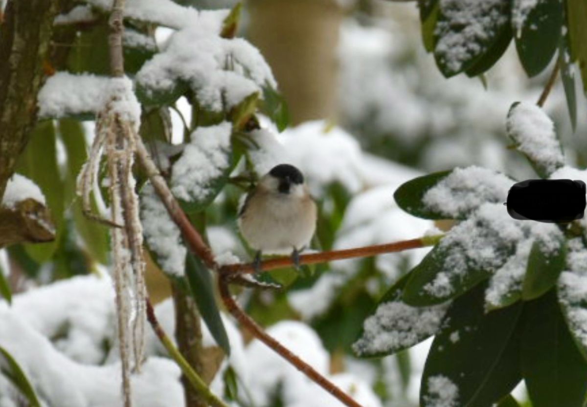 Daar kan je goed zien wat een pak. Ik maak ook even een foto, wel door het raam..in het bos is er dus wat minder sneeuw dan op de open plekken of de weg maar zelfs in het bos zakken de merels goed diep weg. De taxussen zijn met sneeuw extra mooi vind ik.