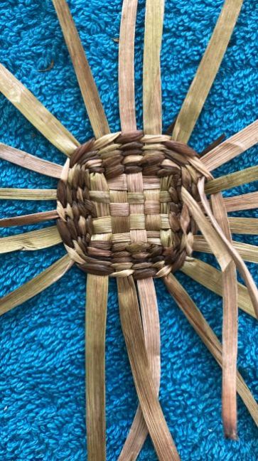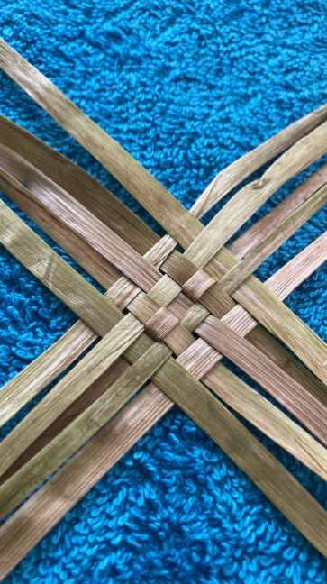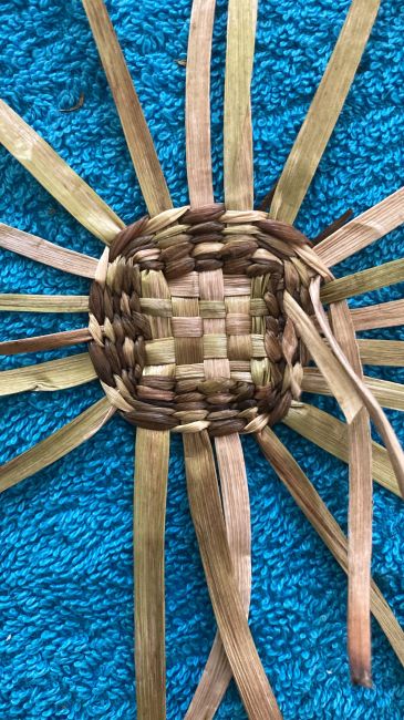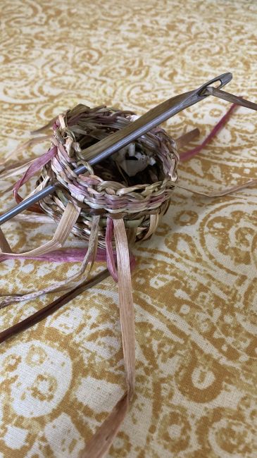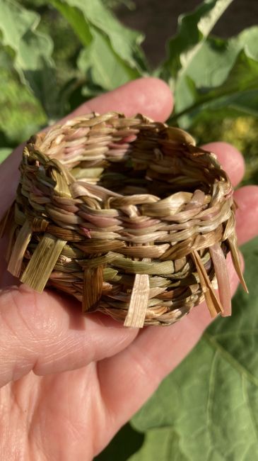 Ik ben natuurlijk wel benieuwd of ik iemand ook zo enthousiast heb gemaakt dat die ook is gaan vlechten? Mijn laatste vlechtwerk, nogmaals met paardenbloemenstengels. De stengels voor de basis heb ik even onder het strijkijzer gehad om een mooie platte start te maken. Dan verder met de wat dunnere stelen die ik eerst nat gemaakt heb en een twintig minuten in een vochtige handdoek gehouden. Daarna geen foto’s gemaakt totdat de mand bijna klaar was. De bovenste rand is van rabarberschil. De staanders worden hier weg gewerkt met een tapijt naald. Ik zou eigenlijk een dunnere moeten hebben maar kon het niet vinden. Klein maar fijn, lekker stevig en veerkrachtig. En wat doe je er nou mee, met zo’n priegelmandje?