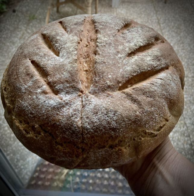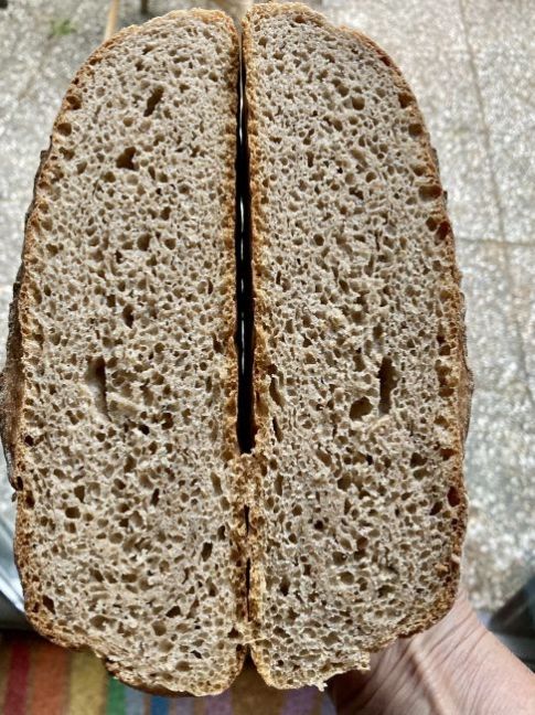 Gist brood vandaag, 80 gram rode emmer meel en 470 gram spelt. De nieuwe oven uitgeprobeerd, ging prima. Het brood is niet hoog, maar mooi hoog genoeg voor deze mix en smaakt heerlijk!.