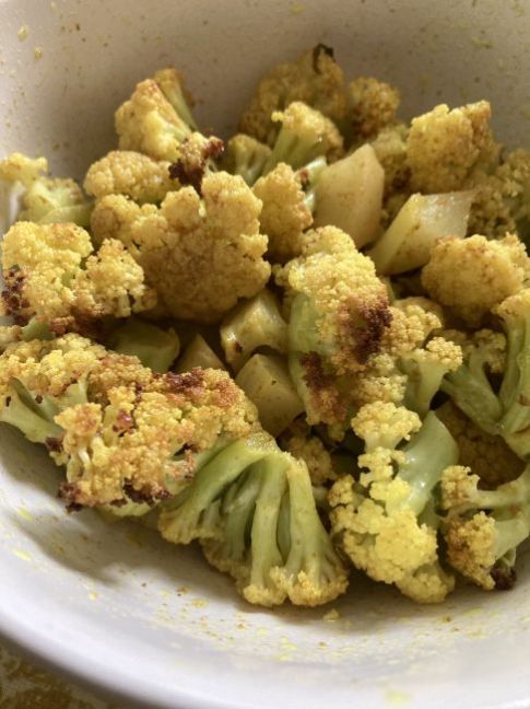 Dé MTF bananencake hè! We hadden wortels met komijnekaas en sinaasappelsap, gebakken radijsjes met mosterdzaad en koriander en bosuitjes uet, geroosterde bloemkool (uJt) met kurkuma koriander kaneel en komijn en komkommerraita met yoghurt komijn en uet munt. Verder geurige specerijenrijst en zoete aardappelcurry met uet peterselie. Een zacht gekookt eitje erbij uJT. Zo dat was idd lekker.