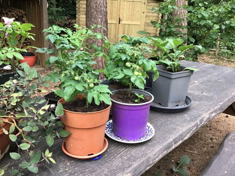 Al mijn tomatenplanten (nou ja al, ik heb er 6) verpot na wat voorlopig hun definitieve pot wordt, je weet maar nooit of ik dat later nog ga aanpassen. Idem voor de twee Golden Eggs, de munt planten. Verder in het voedselbos een plek gezocht voor de Japanse gember en er ook maar wat stokjes omgeen gezet, kans dat ik ga vergeten waar t staat als alles eromheen hard gaat groeien. Een paprika uit een bak gehaald en in een andere gezet, de courgette kreeg toch wel erg grote bladeren al en de tuinbonen waar deze plant dan na zou komen zijn nog niet klaar. Zaailingen koriander in de grond gezet.