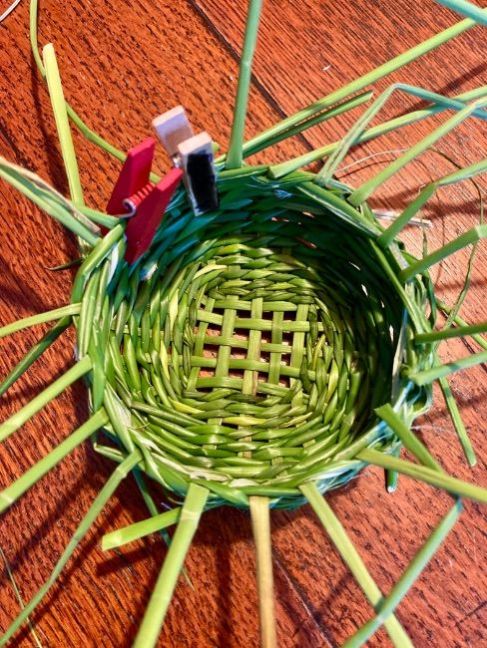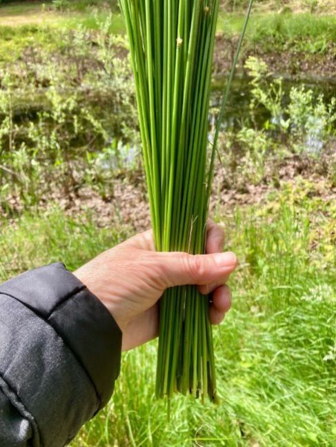Tussen de buien een bosje pitrus gehaald dat groeit hier aan de vijver en er een mandje mee gemaakt. Niet gemakkelijk dat verse materiaal maar ik ben vooral trots op het feit dat ik de ronding erin kreeg zonder teveel breuk van de stengels.