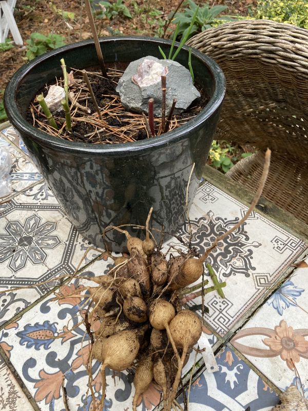 Ik laat de grote dahlia’s in de grond deze winter het is een risico. Ik heb er wel een emmer dennennaalden per plant op gelegd. Een enkele slecht geplaatste heb ik opgegraven en die bewaar ik als schone kluit in een krant in het schuurtje. Nu heb ik ook nog twee mini plantjes in een pot zitten. Die deden het nog niet geweldig afgelopen jaar. Kan ik deze ín de pot in de schuur bewaren? Of liever toch uit de aarde❓