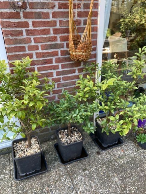 Mijn kumquats zijn weer terug op Knarrestein en kunnen aan een revalidatie programma beginnen. Ik maak even een foto dan kunnen je het verschil zien van mijn oude planten uit 2019 en in het midden een die ik afgelopen jaar kreeg van Anna3 uit hetzelfde jaar’19. Mijn planten hebben nog steeds erg last van een gebrek. Geel blad. De plant van Anna is mooi groen hoe dat komt geen idee . Gisteren heb ik wat nieuwe aarde onderin de potten toegevoegd en de grindlaag weer op orde gebracht.