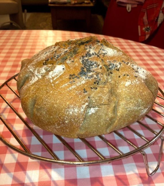 Lekker bezig met een spelt broodje..dat hoop ik want ik heb de handelingen van koelkast en vouwen zo’n beetje in omgekeerde volgorde gedaan. Ik had de desem gisteren begin van de avond aangemaakt zeg maar en ging toen voor een uurtje weg. Dat duurde langer, en om 11 ben ik het met het water en meel, half bloem, gaan mengen. Meteen de koelkast in. Vanmorgen vond ik dus een natte koude klodder slap deeg in de koeling. Tja wat te doen. Beetje gist erbij gedaan een gram of zo. Nog eens goed door gekneed. Strekken en vouwen en wachten en strekken en vouwen en wachten. De coilfold vouw van dubbelmm erachteraan, opbollen, wachten en na een half uurtje hup in het rijsmandje. 2,5 uur. Dan bakken op 225 30 minuten met en twintig minuten zonder deksel. Twee ijsklontjes op het draai plateau. Dit is het nog hete resultaat. Het ruikt zuur als in zuurdesem! Foto van een sneetje volgt.- Wat heb je vandaag (of gisteren) in de moestuin gedaan 2024