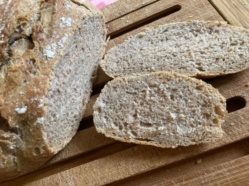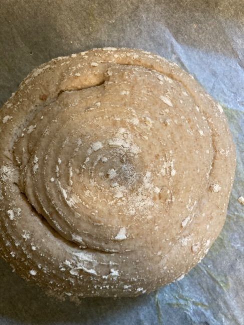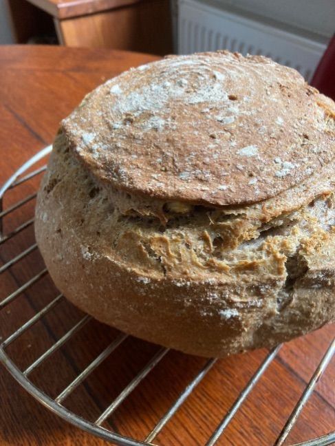 Het is de oven bakken trekt me nog steeds erg aan, vooral het zelf in de hand hebben van de structuur en vochtigheid van het deeg tijdens het brood malen proces. Zo heb ik vandaag na bij dit brood uiteindelijk meer water gedaan. Ik kreeg de tip om in de combi oven het brood langer te bakken en er een ijsklontje bij te leggen tijdens het eerste deel van het bakproces. Ik heb het natuurlijk over gist brood, met desem ben ik nog te onzeker om dat met deze nieuwe vorm van bakken te proberen. Vandaag dus kastanje brood gebakken, dat wil zeggen speltbrood met 1/3 slaege meel en 2/3 Frans T110. De hoeveelheid kastanjes bedroog in totaal 60 grm. Half meel en half gekookte stukjes. Het was het allerlaatste Franse meel ik ga het heel erg missen😭 Na de tweede rijs: Ik wilde graag zo’n kapje op het gebakken brood dat vind ik er mooi uitzien. Niet helemaal gelukt misschien had ik het in 1 snede moeten doen? Enfin zo kwam het brood uit de oven na 30 minuten met en twintig minuten zonder deksel: De smaak is heerlijk! Ik weet niet of het echt kastanje is dat je proeft eerder een combi met het nootachtige van het spelt denk ik. O ik had er nog iets van 30 gram roomboter bij in.