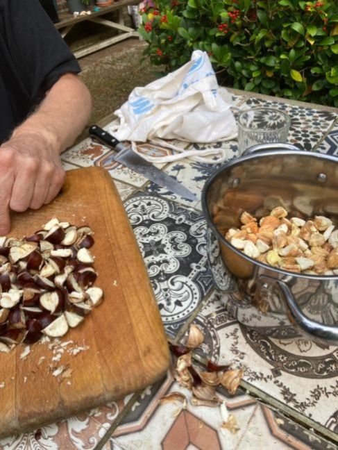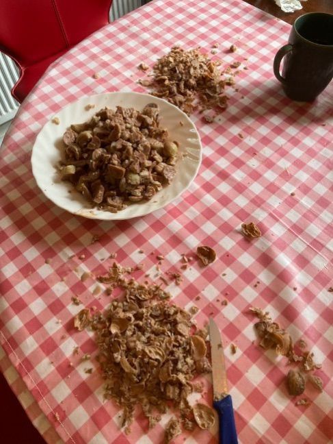 Prachtig ja zo’n mesje totaal afgesleten door het weghalen van gras ed tussen de tegels uit. Mjn kastanjes avontuur is mislukt en toch weer niet. Gisteren de vruchten in vieren gehakt en die kwarten uit de schil gehaald, 5 minuten gekookt en nacht laten staan. Toen zag de hele bereiding eruit als een dikke grijsrose soep met hier en daar losse vellen. Zachte kas5anjekwarten. En ook veel kastanjes waar de vel niet van af was. We dachten dat het niks meer zou worden maar t is meegevallen we hebben samen van ruim de helft de tweede vel eraf gehaald en deze kastanjes in porties ingevroren. Het andere deel heb ik gemalen dat ging natuurlijk erg gemakkelijk en dat ligt nu op vier bladen in mijn droogtoren. Dat meel ga ik gebruiken voor brood en soep en zo. O en dat water van het koken bevatte duidelijk die lichtzurige wrange smaak van het tweede velletje die ik onprettig vind dus dat was er mooi vanaf gekookt..aan t meel proef ik het niet meer.