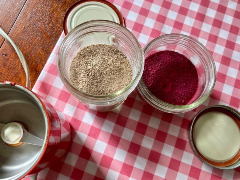 Mooi zeg! Ik heb heel wat minder meel. Niet gewogen maar gewoon een aardige pot hier op de foto samen met broer bieten poeder. Koffie molentje deed zijn werk goed!