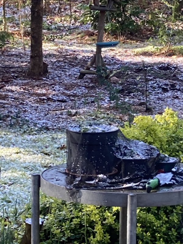 Idem hier in het bos. Vanmorgen 0 graad bij het opstaan. En dat was niet erg vroeg. Zo even kijken of mijn koukleumende peulen het hebben overleefd..het is niet helemaal hun favoriete temperatuur