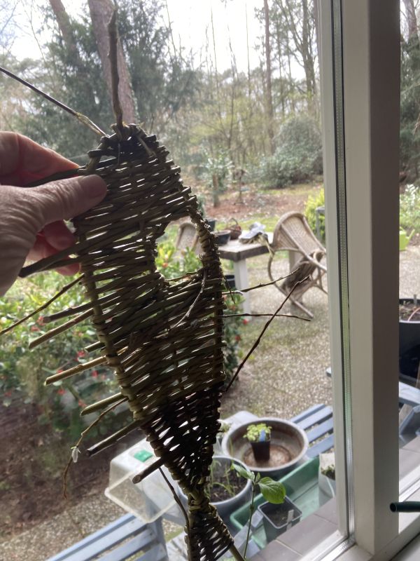 Hoi Wortel heb je deze stengels nog gedroogd? Hier had ik vanmorgen een vijgenstek genomen veel te lang dus een stuk heb ik geschild en de stukjes schil meteen gebruikt voor staanders van een klein mandje met pitrus wat ik nog gedroogd had liggen en bovenop wat raffia. Nu moet hij nog even drogen. Van de cursus (waar ik eigenlijk niks uitvoer want ik heb helemaal geen zin meer in nog een mand) wat wilgen tenen meegenomen en ben nu bezig met een vis..