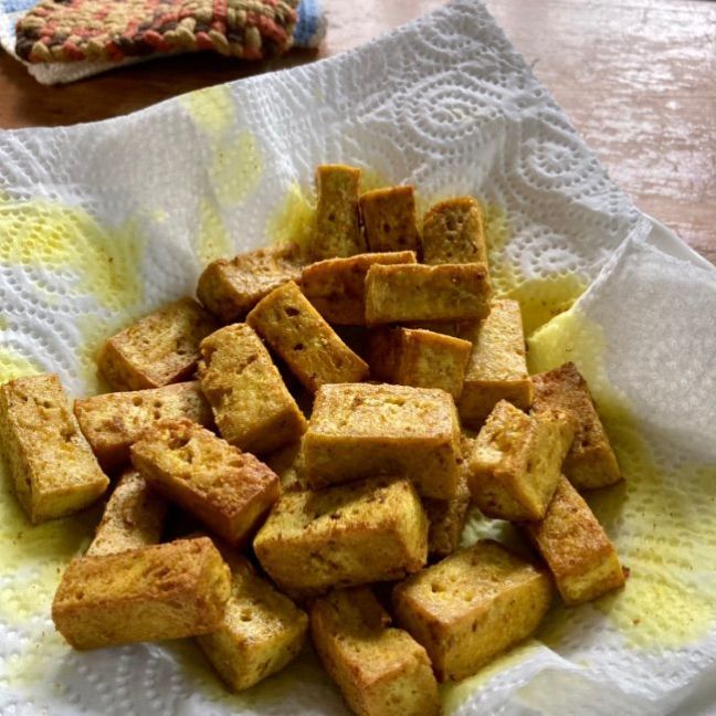 Heerlijke krokant gebakken Indiaas gemarineerde tofu met rijst en een wortel asperge curry. Uet koriander zaad en selderijblad.